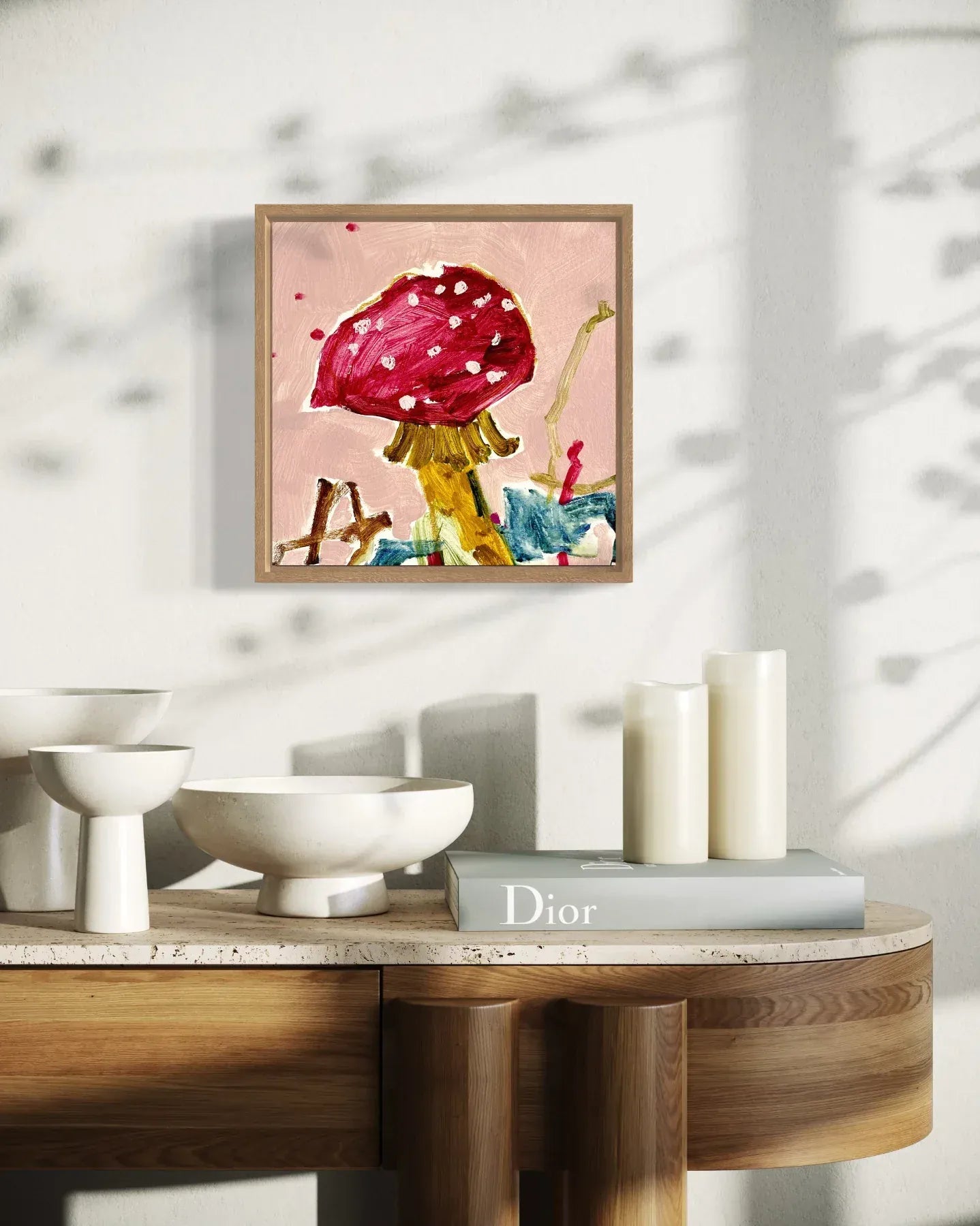 Inspired by life in a rural landscape, Kate Owen creates intuitive, semi-abstract works that explore the connection between nature and human experience. Drawing on organic forms — particularly fungi — this whimsical piece suggests shelter, curiosity, and gentle storytelling.