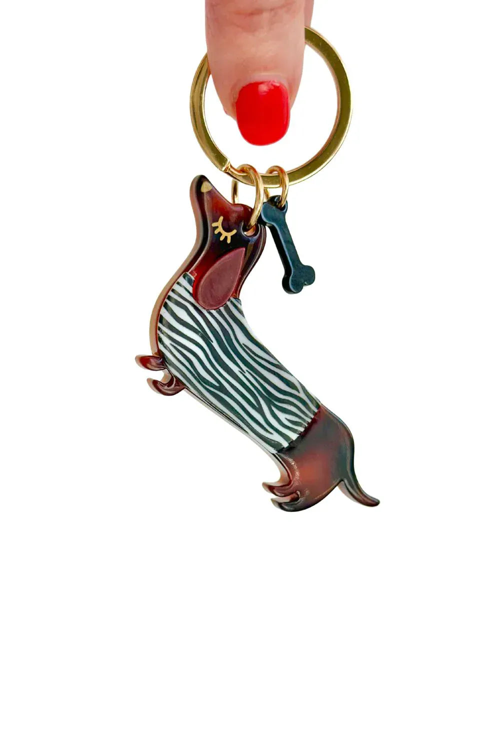Add a playful touch to your keys or bag with the Sausage Dog and Bone Keyring by Mosk. Made from perspex with a fun zebra-inspired design, it features a sweet little bone charm and polished gold hardware for a stylish finish.
