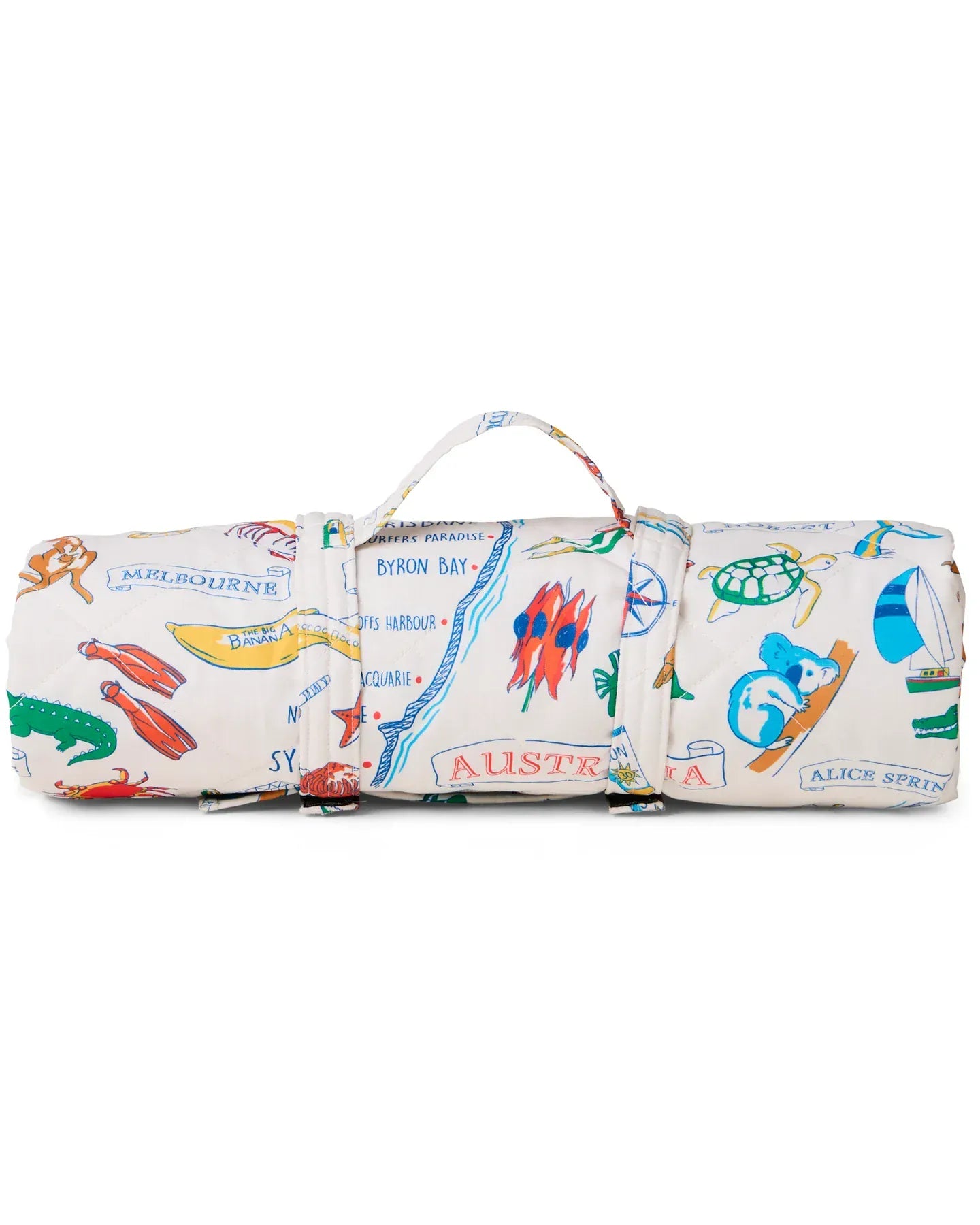 Make every outdoor moment brighter with the Aussie Road Trip Picnic Mat by Kip & Co. Featuring a bold print of iconic Aussie sights, it’s lightweight, water-repellent and generously sized for beach days, park picnics and sunny afternoons. Rolls easily into a carry bag with an included strap.