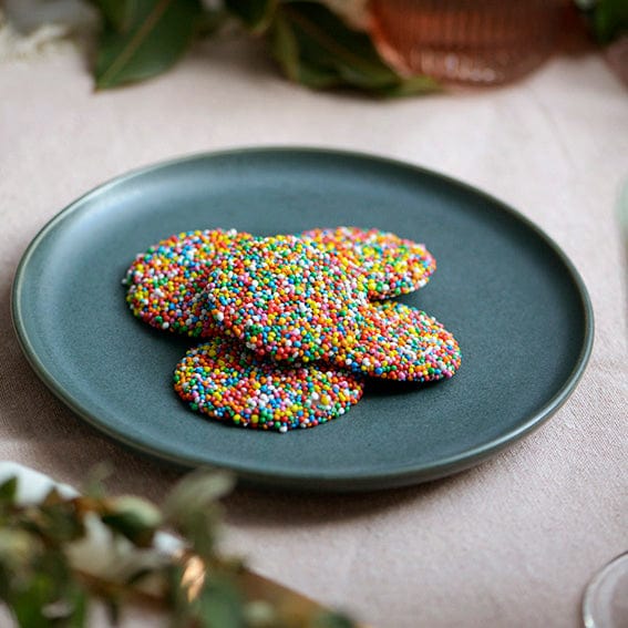 Milk chocolate discs covered in 100's and 1000's. Approx. 5-6cm in diameter.