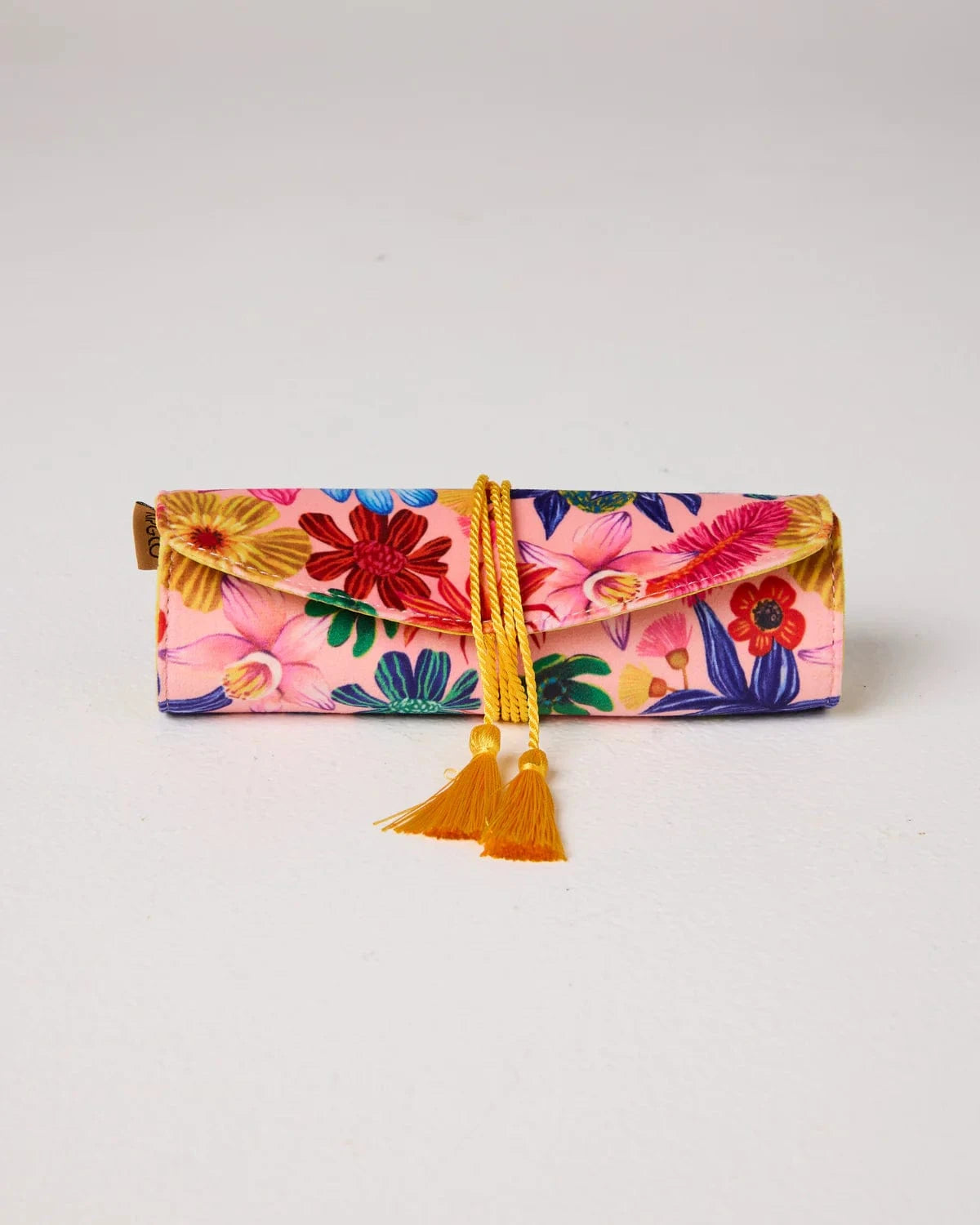 Keep your treasures safe with Kip&Co’s Wild Flowers In Bloom Velvet Jewellery Roll, featuring painterly florals on soft pink velvet. Compact and practical, it includes three zipped compartments for smaller pieces and a soft press-stud strap to hold rings securely. Perfect for travel or at-home storage.