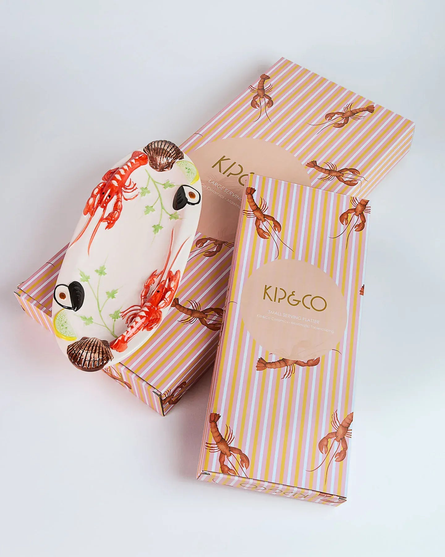 The Kip & Co Lobster Bisque Oval Platter brings a touch of seaside nostalgia to your table. Hand painted with lobsters, shells, mussels and lemon wedges on white ceramic, it’s perfect for serving sides, salads or seafood spreads.