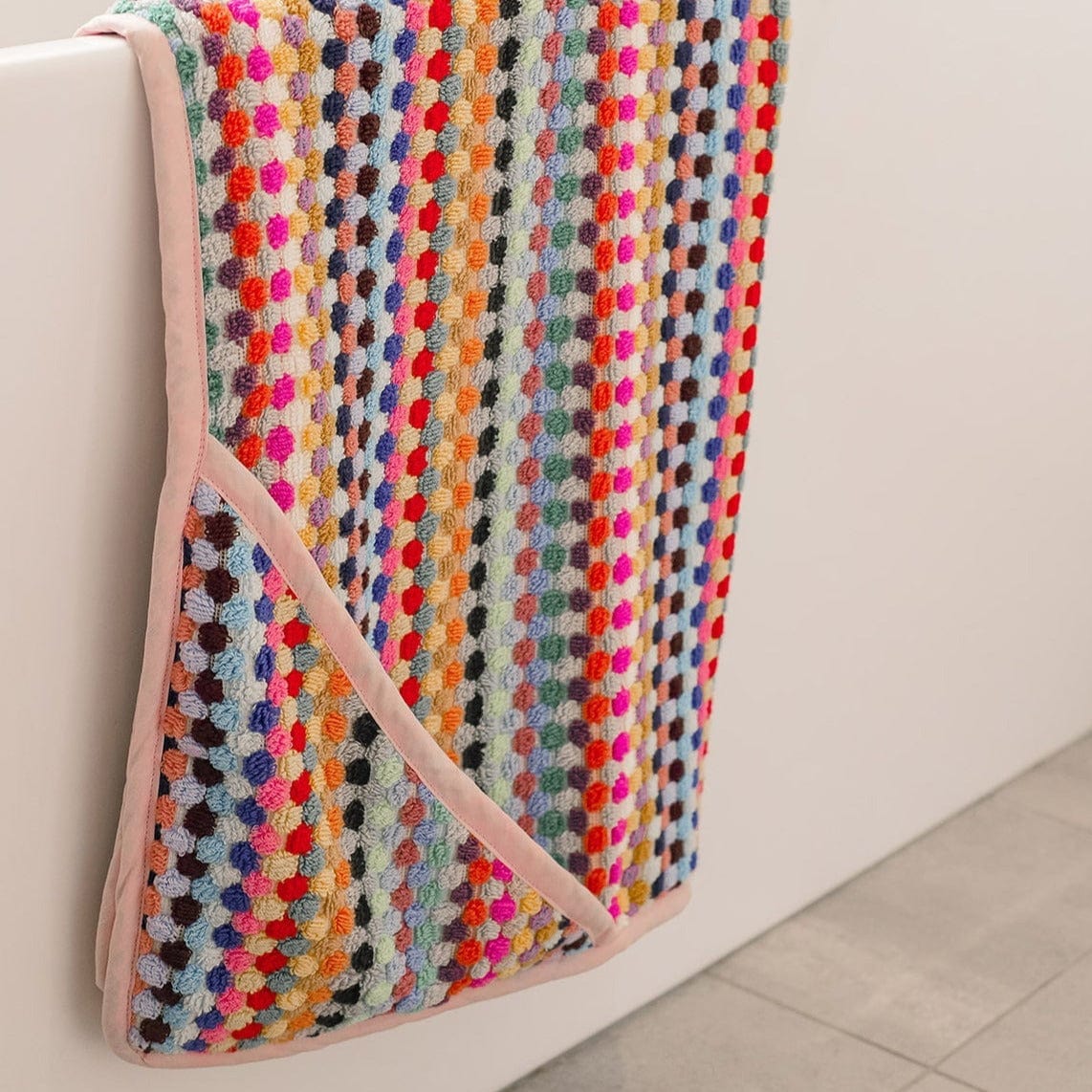 A luxurious hooded baby towel in vibrant candy multicolours, made from rows of pompoms.